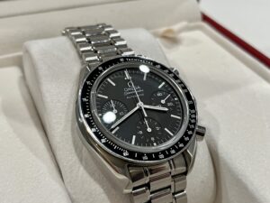 今回ご紹介させて頂くスピードマスターはインダイアルが横目でベゼルは黒、文字盤はマッドな黒となっており、