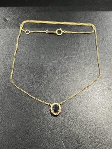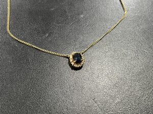 こちらのネックレスは中央にサファイアが施されており、縁にはメレダイヤが施されたデザインネックレスになります(^^)✨